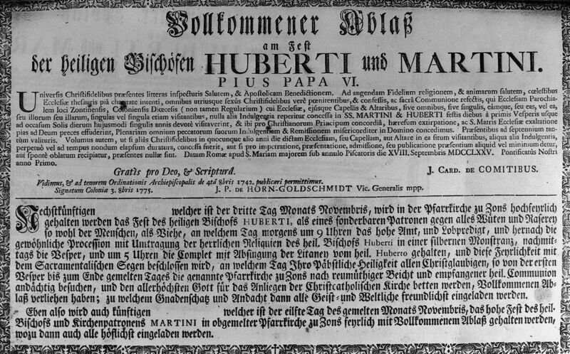 Gedruckte Urkunde: 1775 gewährte Papst Pius VI. für die Zonser Pfarrkirche den vollkommenen Ablass am Hubertus- und Martinustag.