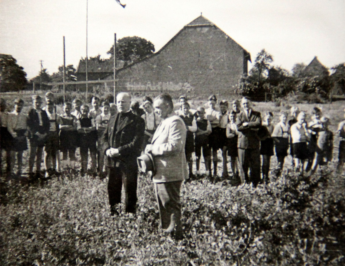 Im Vordergrund Pfarrer Johannes Klüwer (links) und Stadtdirektor Johann Scheer, dahinter Schulkinder mit dem Hauptlehrer Mathieu Fausten.