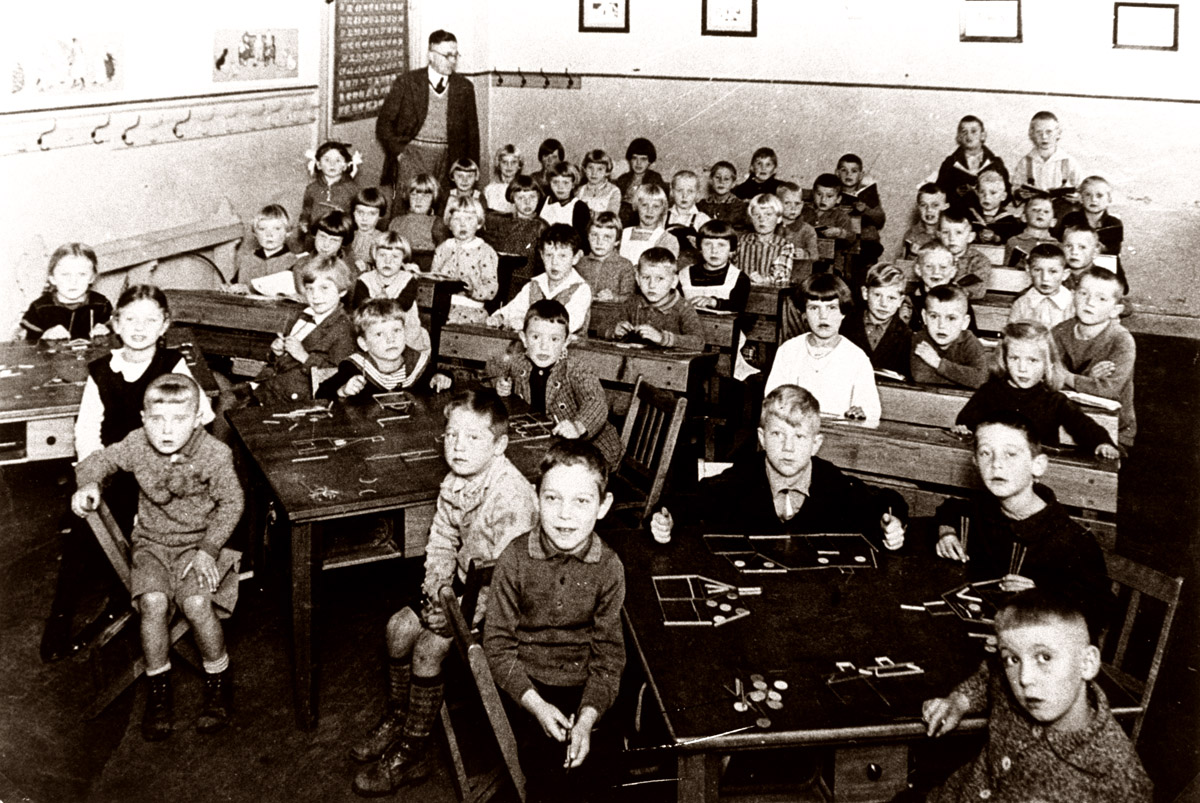 Schulklasse der katholischen Zonser Volksschule mit Lehrer Heinz Riffel um 1930.