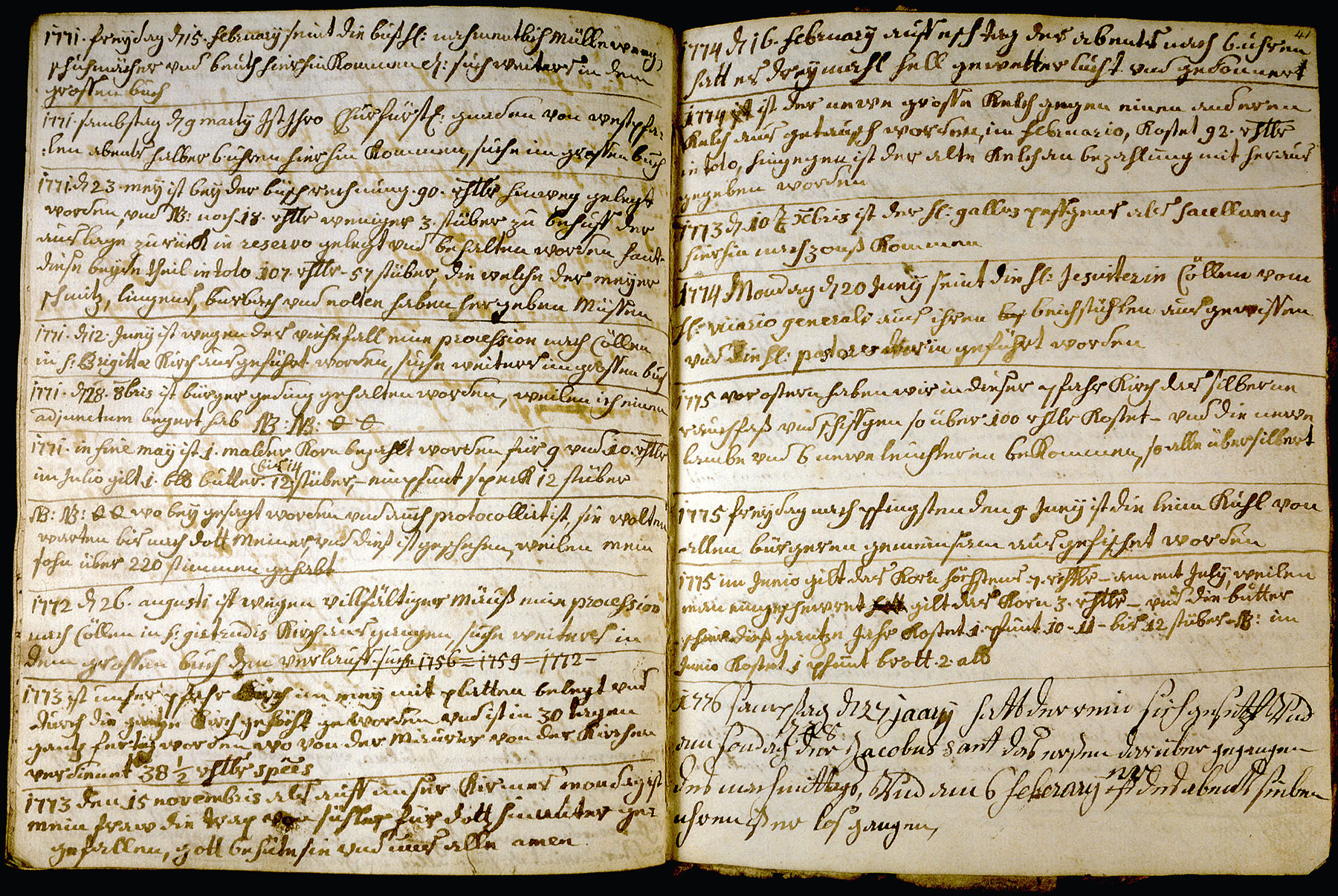 Doppelseite aus dem ersten Autografen von Johannes Peter Schwieren und Sohn Johannes Hermann Schwieren (rechts unten erster Eintrag von Johannes Hermann).
