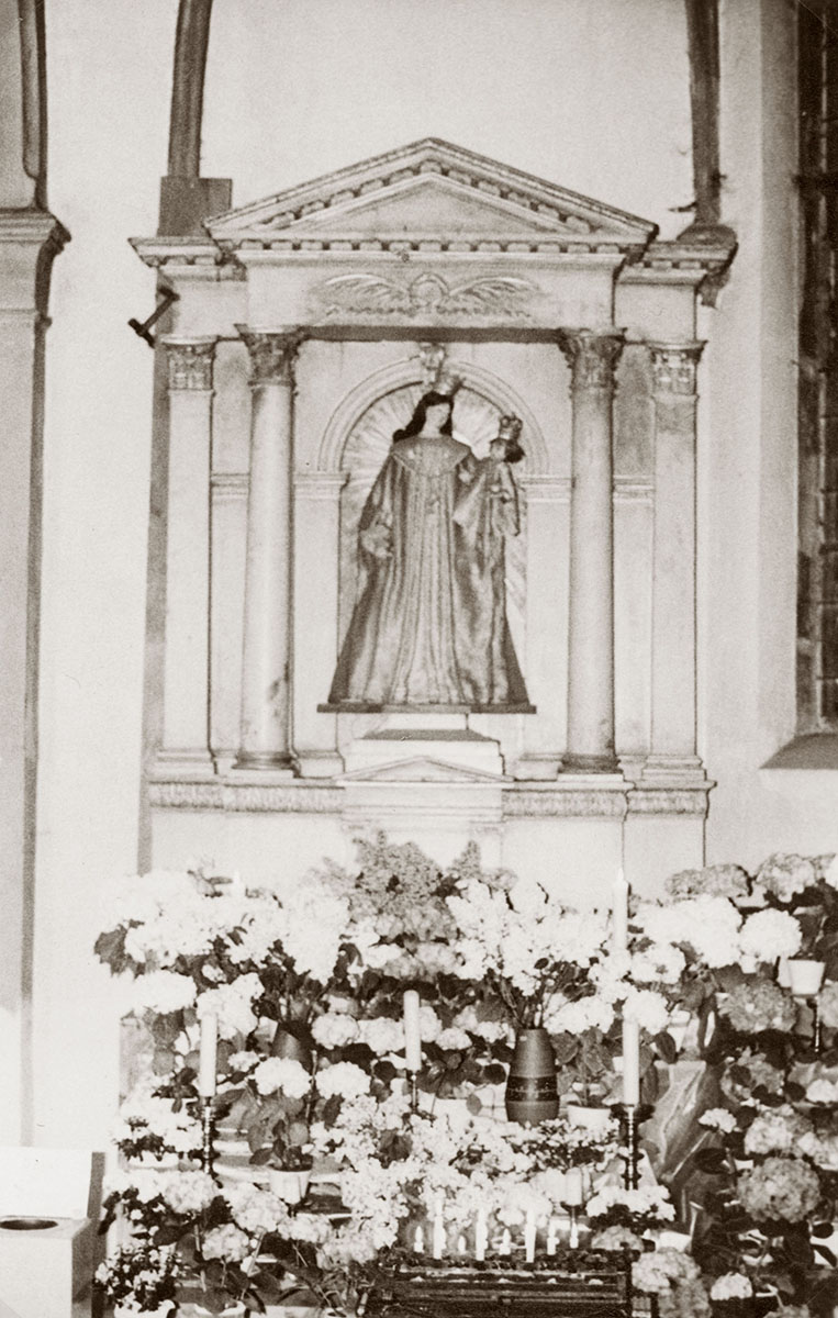 Die "Wundermadonna" mit Blumenschmuck auf einem Seitenaltar in der Zonser Pfarrkirche, wohl 1930er Jahre.