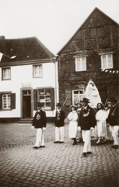 Festzug am 1. Mai 1932 anlässlich des 75-jährigen Jubiläumsfestes der Wiedereinführung der "Wundermadonna" in die Pfarrkirche. Zu sehen sind auf dieser Aufnahme vom Marktplatz Mitglieder der Hohenzollernkompanie und in Weiß gekleidete Jungfrauen.