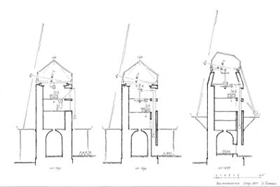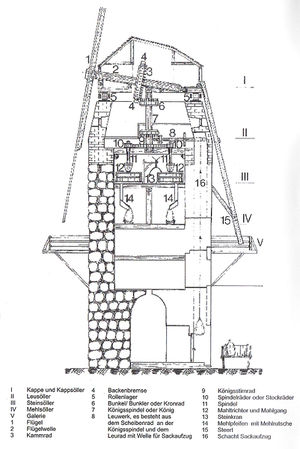 Wenn der Mittelbalken, wie zu vermuten ist, ursprünglich direkt auf den Konsolen geruht hat, dann war der Zwischenraum zwischen Balken und Decke ausreichend, hier ein Stirnrad anzubringen, wie es sich heute im fünften Geschoss befindet. Den Boden des fünften Geschosses muss man sich dazu etwas höher liegend vorstellen. Wenn man an Stelle des Mittelbalkens das untere Lager der Königsspindel annimmt und dafür die Länge der heutigen Königsspindel nimmt, dann kommt das obere Lager genau auf dem Niveau zu liegen, auf dem sich der obere Lagerbalken in der drehbaren Kappe befunden hat. Hiermit stimmt auch das Niveau des kreisförmigen Bodenrings überein, auf dem sich das Rollenlager der Kappe bewegte. Die Königsspindel reichte ca. 40 cm darüber, und dies entspricht auch dem heutigen Abstand. Somit lässt sich die Situation der Mühle vor der Aufstockung rekonstruieren.