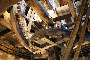 Die unterschiedlichen Teile des Innengetriebes sind je nach Beanspruchung aus unterschiedlichen Holzarten hergestellt: Die Räder des Rollenlagers sind aus Ulmenholz, das nicht spleißt, die Zähne der Zahnräder (Kämme), die besonders stark beansprucht wurden, sind aus Hainbuchenholz. Räder und Getriebe wurden zur Verminderung der Reibung regelmäßig mit Bienen- oder Kerzenwachs geschmiert. Das ca. 3 m im Durchmesser messende Kammrad auf der Flügelwelle hat 65 etwa 50 cm lange Zähne oder Kämme, die in rechteckigen Löchern stecken und von der Rückseite verkeilt sind. Sie mussten alle drei bis vier Wochen mit Bienenwachs eingeschmiert werden und wurden bei Verschleiß ausgewechselt. Vor ihrem Einsetzen hat man die gut getrockneten Zähne eine Stunde in reinem Brunnenwasser gekocht, um sie dauerhafter zu machen.[6] Die zweiteiligen Bremsbacken am Kammrad (oberhalb und unterhalb) sind aus Weidenholz. Indem die obere Bremsbacke bei der Betätigung etwas früher anzog, war gewährleistet, dass die Flügelwelle stabil in den Lagern blieb. Der Müller konnte die Bremse von innen und außen betätigen: Von außen zog er an einem Seil von der Galerie aus, von innen stand ihm ein separates Bremsseil zur Verfügung.