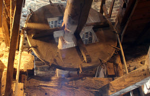 - Zweite Phase (1691-1832/33): 1691 erfolgte ein größerer Umbau zwecks Erhöhung des Umsatzes. Das Innengetriebe wurde auf zwei Mahlsteinpaare ausgeweitet, und es wurde unter Nutzung der bestehenden Türnischen ein Sackaufzug ausgebrochen bzw. angebaut, über den die Säcke fortan mechanisch (mittels Windantrieb) befördert werden konnten. 1736 wurde eine Tür zum Verlies gebrochen.