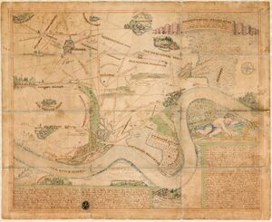 1756 wurden die bestehenden Allianzen aufgelöst, Preußen verständigte sich mit Hannover-England, und Habsburg versöhnte sich mit Frankreich. Mit dem Einfall Preußens in Sachsen nahm ein neuer Krieg seinen Anfang, der sich auch in den niederrheinischen Gebieten deutlich bemerkbar machen sollte: der Siebenjährige Krieg (1756–1763). Die rheinischen Fürsten schlossen sich mit Ausnahme einiger kleinerer Herren der Opposition gegen Preußen an. Im Frühjahr 1757 zog eine starke französische Armee unter Marschall d`Estrées durch das niederrheinische Gebiet, um die preußischen Gebiete zu besetzen. Nach vergeblichen Bemühungen, die hannoverschen Verbündeten für eine offensive Kriegsführung auf der linken Rheinseite zu gewinnen, musste Preußen Kleve einschließlich der Festung Wesel räumen. Auch in Geldern, wo noch Widerstand geleistet wurde, musste die Garnison kapitulieren. Mit der Schlacht bei Roßbach noch 1757, die von den preußischen Truppen entschieden wurde, endete der Vormarsch der Franzosen in Richtung Osten. Im Frühjahr 1758 gelang es der mit Preußen verbündeten Armee unter Herzog Ferdinand von Braunschweig, die Franzosen über den Rhein zurückzuwerfen. Die Masse der französischen Armee konzentrierte sich Ende April 1758 am Niederrhein. Magazine befanden sich in Wesel, Düsseldorf und Krefeld. Wesel diente auch 1757 als Drehscheibe für die Versorgung der französischen Armee in Norddeutschland. In der Schlacht bei Krefeld am 23. Juni 1758 schlug die Armee Herzog Ferdinands das zahlenmäßig überlegene französische Heer und nahm anschließend Neuss, Roermond und nach einer Beschießung auch Düsseldorf ein. Die sich zurückziehenden Franzosen lagerten vom 24. bis 25. Juni zwischen Zons und Dormagen, wo sie erhebliche Schäden anrichteten.[96] In der Gefahr, durch die Franzosen aufgrund ihrer Operationen beiderseits des Rheins abgeschnitten zu werden, befahl Herzog Ferdinand den Rückzug. Nach vorausgegangenen Gefechten zog die Armee nördlich von Kleve bei Griethausen über den Rhein ab nach Westfalen.[97] Immer wieder zogen in der Folge preußisch-hannoversche Streifcorps u.a. durch das kurkölnische Gebiet. Im Herbst 1760 startete der Erbprinz von Braunschweig mit 20.000 Soldaten einen Angriff auf Wesel. Nach erfolgloser Belagerung zog sich das Heer wieder nach Westfalen zurück. 1762 wurde zwischen England und Frankreich ein Frieden vereinbart. Schließlich endete der Krieg mit der im Februar 1763 erfolgten Unterzeichnung des Hubertusburger Friedens zwischen Preußen und Österreich, in dem die Wiederherstellung der ursprünglichen Verhältnisse in Deutschland festgeschrieben wurde. Erst Anfang März 1763 verließ das letzte französische Regiment die Stadt Düsseldorf.[98] Am 10. Mai des Jahres wurde in der Zonser Pfarrkirche ein Dankfest anlässlich des Kriegsendes gehalten.[99]