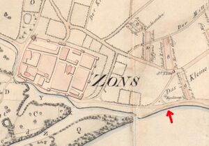 Ausschnitt aus einer Zons-Karte des Mathias Ehmans von 1751 in einer originalgetreuen Kopie aus dem Jahr 1827. Der Kartograf berücksichtigte in der Darstellung auch die 1751 errichtete Vogelstange.