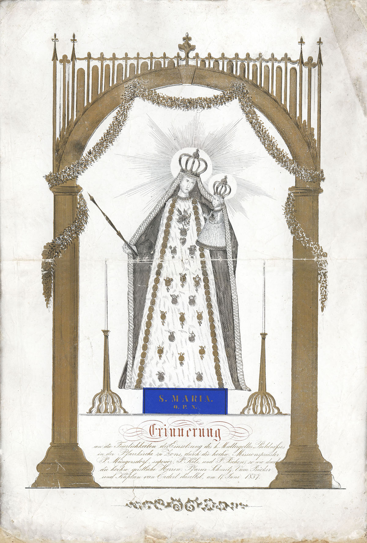 Gedenkblatt (Lithografie) anlässlich der Wiedereinführung der "Wundermadonna" in die Pfarrkirche 1857.