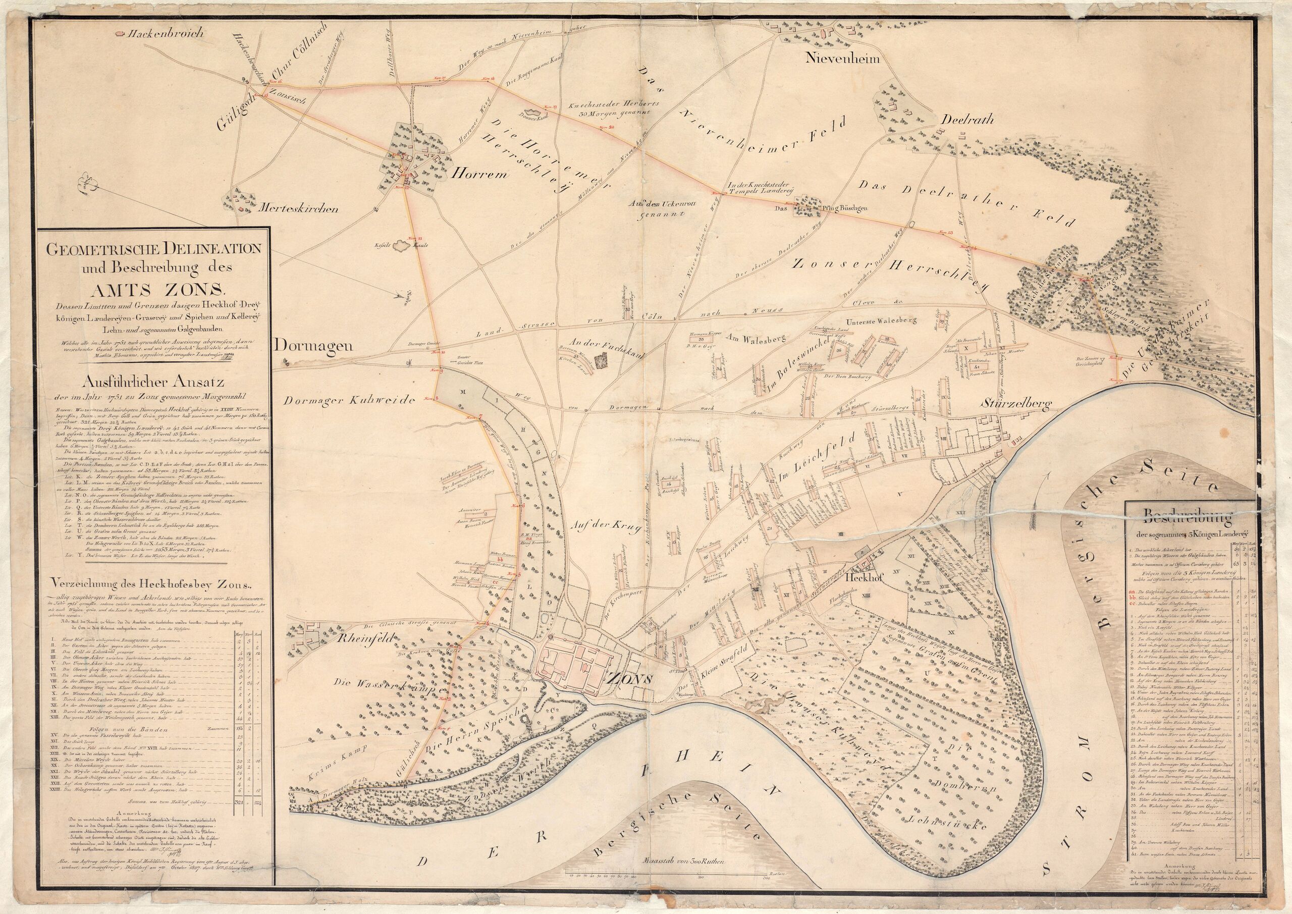 Karte des Amtes Zons von Mathias Ehmans von 1751 (Kopie aus dem Jahr 1827).