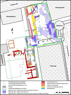 Georg von Eyschen erwarb für den geplanten Klosterneubau ein größeres Grundstück neben dem Juddeturm. Dieses lag im Bereich des ehemaligen Vorburggrabens, für den neben den üblichen Ausgaben besondere Grundsteuern erhoben wurden: Neben den üblichen Steuern an die Kellnerei lastete auf dem Grundstück die Verpflichtung, jährlich einen Malter Korn als Almosen an die Franziskaner in Brühl zu entrichten. Letzteres wurde den Konventualen erlassen.[7] Das Domkapitel wurde zudem wiederholt um Nachlass der auf dem Bauplatz lastenden Steuer von 2 ½ Maltern Weizen und einer Henne gebeten. Es ist nicht bekannt, ob auch dieser Bitte entsprochen wurde.