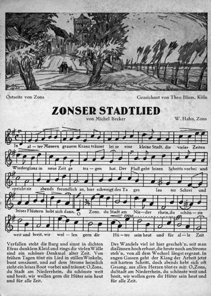 "Zonser Stadtlied" nach dem Text von Dichter Michel Becker aus Köln, Melodie: Musiker und Dirigent Willi Hahn aus Zons. Im oberen Teil ist eine Zons-Zeichnung von Maler und Radierer Theo Blum aus Köln zu sehen. Das Lied dürfte um 1930 entstanden sein.