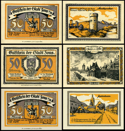 1921 beauftragte die Gemeinde den Kölner Grafiker H. Lütckens oder Lütkens[1] mit der Fertigung einer Serie von Notgeldscheinen zum Nennwert von 50 Pfennig, die Zonser Motive zeigen sollten. Schon die Vorlage der Entwürfe verzögerte sich dann jedoch sehr lange, so dass die Gemeinde die nötige Genehmigung nicht mehr fristgerecht einholen konnte, und die Scheine wurden erst deutlich nach Ablauf des Einlösungstermins (31. März 1922) fertiggestellt. Der Gemeinderat entschied daher in seiner Sitzung vom 13. Juni 1922, einen Teil der Scheine an die Kriegerdenkmalkomitees von Zons und Stürzelberg zugunsten der geplanten Kriegerdenkmäler abzugeben und den anderen Teil zu Sammlerzwecken zugunsten der Gemeindekasse zu verkaufen.[2]