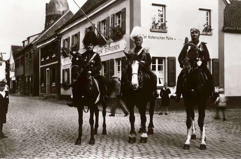 St. Hubertus-Schützengesellschaft: Oberst Arnold Bechlenberg mit seinen Adjutanten Heinrich Gilgen (links) und Jakob Busen Ende der 1920er Jahre in der Feldstraße.