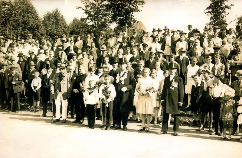 St. Hubertus-Schützengesellschaft: Die Zuschauer einer Parade vor dem Feldtor 1928/29. Schützenkönig war in diesem Jahr Gottfried Erkelenz.