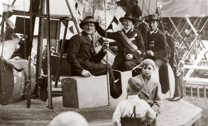 St. Hubertus-Schützengesellschaft: Mitglieder der Hohenzollernkompanie auf einem Karussell ca. 1935.